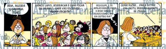 col1719pt TIRA MAFALDA, CÓDIGO ORIGINAL 1719, PORTUGUES, EDIÇÕES MARTINS FONTES.DiálogoProfessora: Bem, agora guardem tudo. Menos o lápis, borracha e uma folha em branco, onde vão escrever: "Prova escrita".Mafalda: Desculpe, e se apelássemos para o bom senso e deixássemos para outro dia? Quer dizer... Para evitar um inútil derramamento de zeros.As tiras da Mafalda, coloridas em português (com gramática atualizada), foram cedidas pela © Martins Editora Livraria Ltda. para licenciamento através da Fotoarena. Foram colorizadas pela editora Glénat.