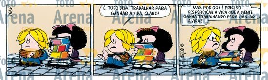 col1755pt TIRA MAFALDA, CÓDIGO ORIGINAL 1755, PORTUGUES, EDIÇÕES MARTINS FONTES.DiálogoMiguelito: É, tudo bem, trabalhar para ganhar a vida claro! Mas porque é preciso desperdiçar a vida que a gente ganha trabalhando para ganhar a vida?As tiras da Mafalda, coloridas em português (com gramática atualizada), foram cedidas pela © Martins Editora Livraria Ltda. para licenciamento através da Fotoarena. Foram colorizadas pela editora Glénat.