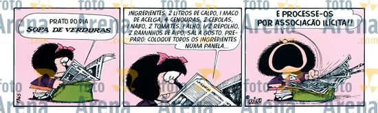 col1765pt TIRA MAFALDA, CÓDIGO ORIGINAL 1765, PORTUGUES, EDIÇÕES MARTINS FONTES.DiálogoMafalda: Prato do dia: Sopa de Verduras. Ingredientes: 2 litros de caldo, 1 maço de acelgas, 4 cenouras, 2 cebolas, 1 nabo, 2 tomates, 1 alho, ¹/² repolho, 2 raminhos de aipo, sal a gosto. Preparo: Coloque todos o ingredientes numa panela... E processe-os por associação ilícita!!As tiras da Mafalda, coloridas em português (com gramática atualizada), foram cedidas pela © Martins Editora Livraria Ltda. para licenciamento através da Fotoarena. Foram colorizadas pela editora Glénat.