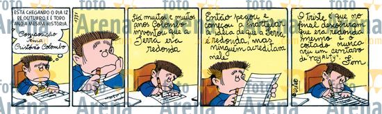 col1771pt TIRA MAFALDA, CÓDIGO ORIGINAL 1771, PORTUGUES, EDIÇÕES MARTINS FONTES.DiálogoManolito: Está chegando o dia 12 de outubro e é todo ano a mesma história. Composição. Tema: Cristovão Colombo. "Há muitos e muitos anos Colombo inventou que a Terra era redonda. Então pegou e começou a martelar a ideia de que a Terra é redonda, mas ninguém acreditava nele. O triste é que no final descobriram que era redonda mesmo e o coitado nunca viu um centado de 'royalty'. Fim"As tiras da Mafalda, coloridas em português (com gramática atualizada), foram cedidas pela © Martins Editora Livraria Ltda. para licenciamento através da Fotoarena. Foram colorizadas pela editora Glénat.
