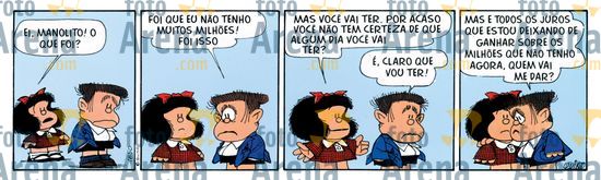 col1850pt TIRA MAFALDA, CÓDIGO ORIGINAL 1850, PORTUGUES, EDIÇÕES MARTINS FONTES.DiálogoMafalda: Ei, Manolito! O que foi?Manolito: Foi que eu não tenho muitos milhões! Foi isso!Mafalda: Mas você vai ter. Por acaso você não tem certeza de que algum dia você vai ter?Manolito: É, claro que vou ter! Mas e todos os juros que estou deixando de ganhar sobre os milhões que não tenho agora, quem vai me dar?As tiras da Mafalda, coloridas em português (com gramática atualizada), foram cedidas pela © Martins Editora Livraria Ltda. para licenciamento através da Fotoarena. Foram colorizadas pela editora Glénat.