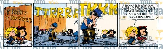 col1857pt TIRA MAFALDA, CÓDIGO ORIGINAL 1857, PORTUGUES, EDIÇÕES MARTINS FONTES.DiálogoMiguelito: A técnica está atrasada. O que não daria um pobre dinossauro para ter alguém que lhe obsturasse uma cárie?As tiras da Mafalda, coloridas em português (com gramática atualizada), foram cedidas pela © Martins Editora Livraria Ltda. para licenciamento através da Fotoarena. Foram colorizadas pela editora Glénat.