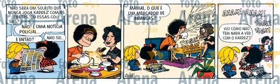col1874pt TIRA MAFALDA, CÓDIGO ORIGINAL 1874, PORTUGUES, EDIÇÕES MARTINS FONTES.DiálogoMiguelito: Não será um sujeito que nunca joga xadrez com as pretas, ou essas coisas?Mafalda: Não! E uma notícia policial!Miguelito: E então?Mafalda: Não sei. Mamãe, o que é um mercador de brancas? Viu como não tem nada a ver com xadrez?As tiras da Mafalda, coloridas em português (com gramática atualizada), foram cedidas pela © Martins Editora Livraria Ltda. para licenciamento através da Fotoarena. Foram colorizadas pela editora Glénat.