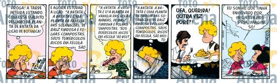 col1879pt TIRA MAFALDA, CÓDIGO ORIGINAL 1879, PORTUGUES, EDIÇÕES MARTINS FONTES.DiálogoSusanita: Droga! A tarde inteira lutando com esse maldito desenho da planta de batata da lição de botânica! E agora estudar a lição: "A batata: A batata é uma planta da família das solanáces, de raíz fibrosa e folhas compostas. Seus tubérculos ricos em fécula são muito..." "A batata: A vatata é u'a blanta da vamília das holanáheas de raíz fibroha e folhas ompostas. eus duérculos, hicos en vécula ão buito." "A batata: A batata é uma planta da família das solnáces de raíz fibrosa e folhas compostas. Seus tubérculos, ricos em fécula, são..."Homem: Ufa, querida! Outra vez purê?!Susanita: Eu sonhei que tinha enviuvado por iniciativa própria, imagine só!As tiras da Mafalda, coloridas em português (com gramática atualizada), foram cedidas pela © Martins Editora Livraria Ltda. para licenciamento através da Fotoarena. Foram colorizadas pela editora Glénat.
