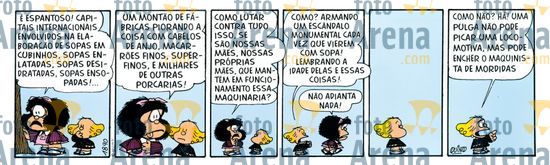 col1890pt TIRA MAFALDA, CÓDIGO ORIGINAL 1890, PORTUGUES, EDIÇÕES MARTINS FONTES.DiálogoMafalda: É espantoso! Capitais internacionais envolvidos na elaboração de sopas em cubinhos, sopas enlatadas, sopas desidratadas, sopas ensopadas! Um montão de fábricas piorando a coisa com cabelos de anjo, macarrões finos, superfinos, e milhares de outras porcarias! como lutar contra tudo isso, se são nossas mães, nossas próprias mães, que mantém em funcionamento essa maquinaria?Liberdade: Como? Armando um escândalo monumental cada vez que vieram com sopa! Lembrando a idade delas e essas coisas!Mafalda: Não adianta nada!Liberdade: Como não? Há! Uma pulga não pode picar uma locomotiva, mas pode encher o maquinista de mordidas.As tiras da Mafalda, coloridas em português (com gramática atualizada), foram cedidas pela © Martins Editora Livraria Ltda. para licenciamento através da Fotoarena. Foram colorizadas pela editora Glénat.