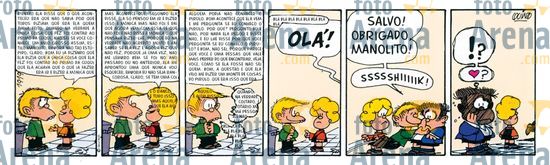 col1919pt TIRA MAFALDA, CÓDIGO ORIGINAL 1919, PORTUGUES, EDIÇÕES MARTINS FONTES.DiálogoSusanita: ...Manolito: Ola!Filipe: Salvo! Obrigado, Manolito!As tiras da Mafalda, coloridas em português (com gramática atualizada), foram cedidas pela © Martins Editora Livraria Ltda. para licenciamento através da Fotoarena. Foram colorizadas pela editora Glénat.
