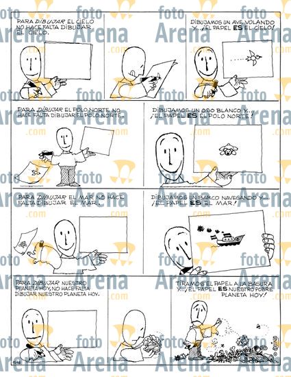 phqpi08-09sp PÁGINA DE HUMOR, ESPANHOL, QUÉ PRESENTE IMPRESENTABLE, EDICIONES DE LA FLOR.Diálogo- Para dibujar el cielo no hace falta dibujar el cielo. Dibujamos un ave volando y... ¡El papel es el cielo! Para dibujar el Polo Norte no hace falta dibujar el Polo Norte. Dibujamos un oso blanco y... ¡El papel es el Polo Norte! Para dibujar el mar no hace falta dibujar el mar. Dibujamos un barco navegando y... ¡El papel es el mar! Para dibujar nuestro planeta hoy, no hace falta dibujar nuestro planeta hoy. Tiramos el papel a la basura y... ¡El papel es nuestro pobre planeta hoy!