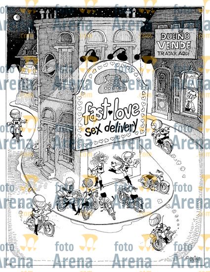 phqpi121sp PÁGINA DE HUMOR, ESPANHOL, QUÉ PRESENTE IMPRESENTABLE, EDICIONES DE LA FLOR.DiálogoFast love. Sex delivery.Dueño vende. Tratar aquí.Interpretação: Estabelecimento em movimento. Loja a venda ao fundo.