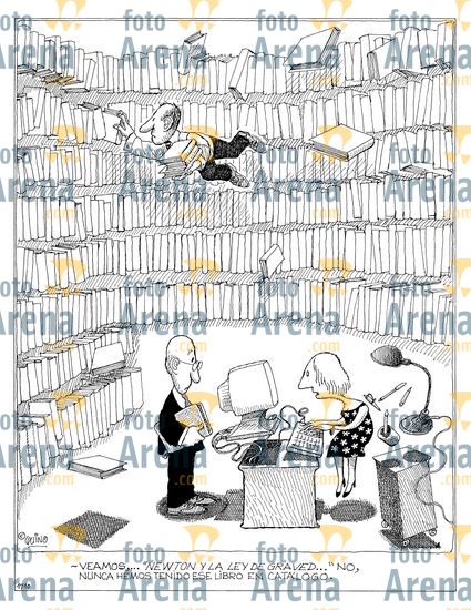 phqpi130sp PÁGINA DE HUMOR, ESPANHOL, QUÉ PRESENTE IMPRESENTABLE, EDICIONES DE LA FLOR.Diálogo- Veamos, "Newton y la ley de graved...", no, nunca hemos tenido ese libro en catálogo.