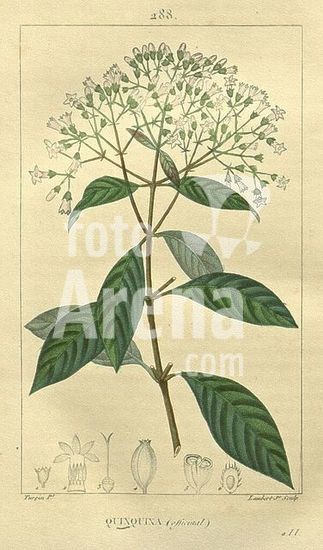 alb15274888 Flore médicale Paris Imprimerie de C.L.F. Panckoucke 1828-1832 1833 botany botany medical copper engraving France graphic media hand-colored herbals materia medica vegetable pictorial works plants, A botanical illustration features a detailed depiction of the Quina tree, showcasing its slender stem adorned with lush, ovate leaves that exhibit a rich texture and prominent venation. The upper portion of the plant is adorned with clusters of delicate, small white flowers, each exhibiting five petals and arranged in an elegant formation. Below the illustration, several labeled sketches of various floral structures and components are presented for educational reference, highlighting the specific parts of the plant and contributing to a comprehensive understanding of its morphology. The overall composition captures the intricate beauty and complexity of this species, inviting viewers to appreciate its natural elegance.