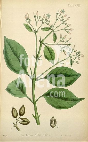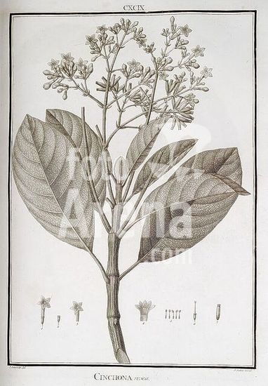 alb15360224 Flora Peruviana, et Chilensis, sive, Descriptiones et icones plantarum Peruvianarum, et Chilensium, secundum systema Linnaeanum digestae, cum characteribus plurium generum evulgatorum reformatis Madrid, Typis Gabrielis de Sancha, 1798-1802, Chile, Peru, plants, A detailed botanical illustration of the Cinchona tree, showcasing its distinct features. The composition includes intricately drawn leaves with prominent veins, highlighted by a cluster of delicate flowers at the top. The flowers demonstrate a range of shapes, with some in full bloom and others in various stages of development. Below the main plant, smaller illustrations depict the reproductive structures, including stamens and pistils, highlighting the botanical details of this significant species known for its historical medicinal uses, particularly in the treatment of malaria. The caption includes the designation 'CXCIX' indicating its catalog number in a botanical collection.