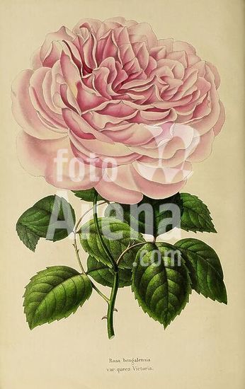 alb15336822 Annales de la Societe royale d'agriculture et de botanique de Gand, Gand, Societe royale d'agriculture et de botanique, 1845-1849, botany, horticulture, societies, flowers, Rosa bengalensis, A beautifully illustrated pink rose with lush petals that have delicate layers, showcasing a soft gradient of color from a light blush to a deeper hue at the center. The flower is set against rich green leaves, which are detailed with prominent veins and a healthy sheen. Below the rose, the botanical name 'Rosa bengalensis var. quin Victoria' is elegantly presented, indicating this particular variety. The overall composition highlights the intricate beauty of the rose and its natural elegance.