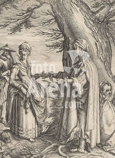 alb15530468 Delft, Clerck, Nicolaes de, Gheyn, Jacob de (II), Netherlands, Stock, Andries Jacobsz., The fortune teller, bottom center - engraved, A gypsy woman (Nuba, according to the caption) stands in front of a thick tree opposite a young elegant lady - she reads her hand and, or takes a coin from her. Behind the young woman a lady with a hat on, next to her a small dog. On the right two seated gypsies, one with a baby in her arms. In the six-line Latin caption the young lady is portrayed as a gullible poor thing, who only hears the future she wants to hear., print, prints, verso middle - stamped, Cui media turget vena, dum medicum quaerit...Futura credi ? Quin pete auxilium praesens, A Roma woman (Nuba according to the caption) stands in front of a thick tree opposite a young elegant lady - she reads her hand and, or takes a coin from her. Behind the young woman a lady with a hat on, next to her a small dog. On the right two seated Roma women, one with a baby in her arms. In the six-line Latin caption the young lady is portrayed as a gullible wretch who is only told the future she wants to hear, height 307 mm, width 207 mm, Northern Netherlands, 1582 - 1648, print maker, printmaker, 1606 - 1610, first quarter 17th century, paper, engraving, engraving (printing process), Work conception, 1565 - 1629-03-29, after a design by, Publication (Event), Publication, 1570 - 1623, publisher.