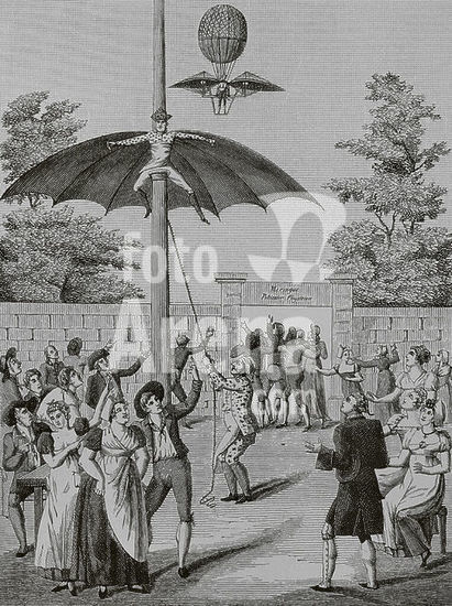 alb16169769 The Flying Man. Animation of the park at the Jardin d'Idalie, Calais, France. Engraving. "Directoire, Consulat et Empire. Moeurs et usages, lettres, sciences et arts. France, 1795-1815" (Directory, Consulate and the Empire of France. Customs and traditions, letters, sciences and arts. France, 1795-1815), by Paul Lacroix. Published in Paris, 1884.
