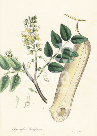 alb18718889 Quina, Peruvian balsam, sweet-smelling balsam tree, Myroxylon peruiferum. Native of South America, used as a stimulant or tonic. Handcolored lithograph from a botanical illustration by George Spratt from William Woodville and Sir William Jackson Hooker's Medical Botany, London, 1832.