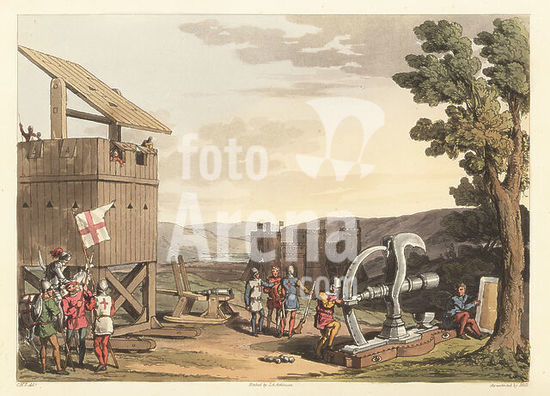 alb18721403 Cannons, siege machines and soldiers, 15th century. Great iron cannon with cascabel swivelling on a perforated arc, mounted on oak, and smaller field mortar Moveable wooden tower on wheels with embattlements, large pavis or mantlet above. View of Holt Castle at rear. English soldiers in surcoats with red cross of St. George. Artillery and tower from Royal MS 14 E iv. Handcoloured copperplate engraving etched by John Augustus Atkinson, aquatinted by John Hill, after an illustration by Charles Hamilton Smith from his own Selections of Ancient Costume of Great Britain and Ireland, Colnaghi and Co., London, 1814.
