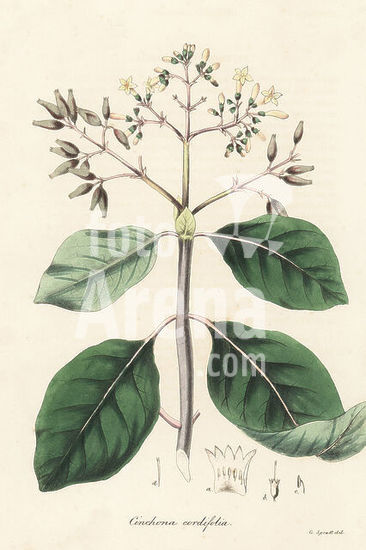 alb18721436 Red cinchona, quina or kina, Cinchona pubescens. Native of Peru, source of quinine. (Peruvian bark, Cinchona cordifolia). Handcolored lithograph from a botanical illustration by George Spratt from William Woodville and Sir William Jackson Hooker's Medical Botany, London, 1832.