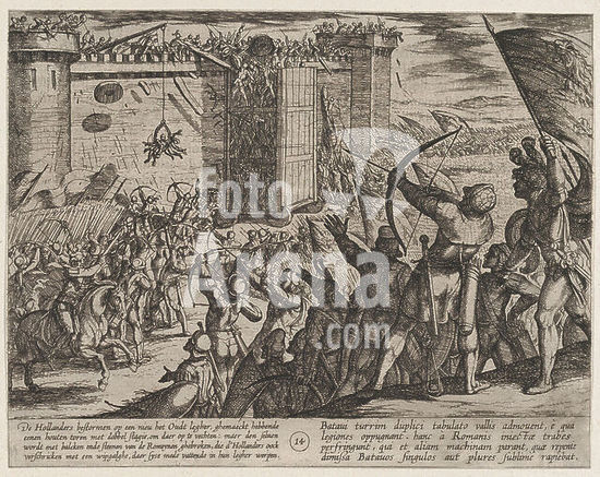 alb3681576 Plate 14: New Attack on the Old Fortress, from The War of the Romans Against the Batavians (Romanorvm et Batavorvm societas). Artist: Antonio Tempesta (Italian, Florence 1555-1630 Rome); After Otto van Veen (Netherlandish, Leiden 1556-1629 Brussels). Dimensions: Sheet: 6 3/8 × 8 1/8 in. (16.2 × 20.6 cm). Date: 1611. Museum: Metropolitan Museum of Art, New York, USA.