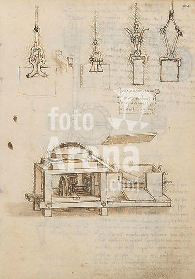alb4117252 Folio f 177v. Codex Madrid I (Ms. 8937) "Treaty of statics and mechanics", 192 folios with 384 pages. Internal format: 215 x 145 mm. PRINCIPLES OF MECHANICS, CINEMATICS, DYNAMICS. TOPOGRAPHIC REFERENCES. APPLIED MECHANICS (MACHINES AND WITS). Museum: BIBLIOTECA NACIONAL DE ESPAÑA, MADRID. Author: LEONARDO DA VINCI.