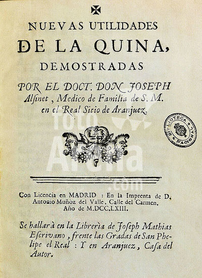 orz056022 NEW UTILITIES OF THE QUININE, 1763. Author: ALSINET JOSE DCTOR. Location: BIBLIOTECA NACIONAL-COLECCION. MADRID. SPAIN.