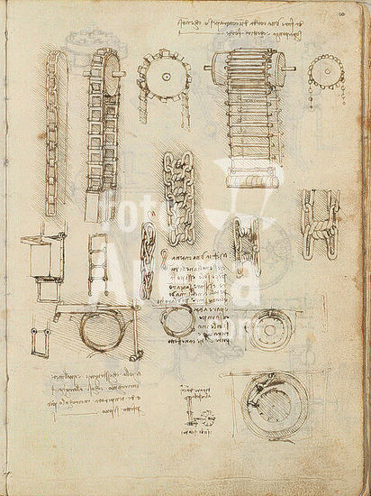 alb4117469 Folio f 109v. Codex Madrid I (Ms. 8937) "Treaty of statics and mechanics", 192 folios with 384 pages. Internal format: 215 x 145 mm. APPLIED MECHANICS (COMPONENTS). PRINCIPLES OF MECHANICS, CINEMATICS, DYNAMICS. Museum: BIBLIOTECA NACIONAL DE ESPAÑA, MADRID. Author: LEONARDO DA VINCI.