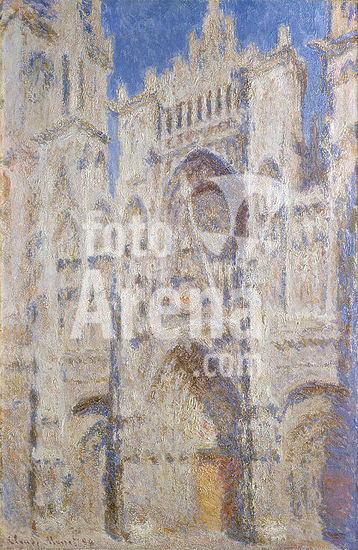 alb3607084 Rouen Cathedral: The Portal (Sunlight). Artist: Claude Monet (French, Paris 1840-1926 Giverny). Dimensions: 39 1/4 x 25 7/8 in. (99.7 x 65.7 cm). Date: 1894.Monet painted more than thirty views of Rouen Cathedral in 1892-93. Moving from one canvas to another as each day progressed, he painted the facade with highly textured brushstrokes that convey the aspect of sculpted stone and make the atmosphere and light palpable. Monet later finished the works in his studio at Giverny, carefully adjusting the pictures both independently and in relation to each other. Hence, most are signed and dated 1894, as is this example. In 1895, Monet exhibited twenty of his cathedral pictures at Galerie Durand-Ruel in Paris. This one was titled Le Portail (Soleil), or The Portal (Sunlight). Museum: Metropolitan Museum of Art, New York, USA.