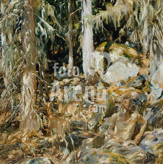 alb3619704 The Hermit (Il solitario). Artist: John Singer Sargent (American, Florence 1856-1925 London). Dimensions: 37 3/4 x 38 in. (95.9 x 96.5 cm). Date: 1908.Sargent based this painting on sketches he had made in Val d'Aosta, in the foothills of the Alps, in northwestern Italy. Although he seems to have been preoccupied with rendering the sundappled landscape in textured brushstrokes, he also included two deer (contrived from a stuffed specimen) and a male figure that evokes religious personages such as Saint Jerome. Yet, when approving The Hermit as the translated title of the picture, Sargent wrote to the director of the Metropolitan, "I wish there were another simple word that did not bring with it any Christian association, and that rather suggested quietness and pantheism.". Museum: Metropolitan Museum of Art, New York, USA.