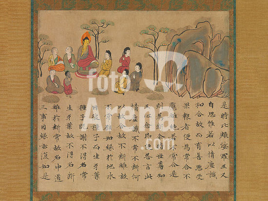 alb3644433 Buddha Preaching, a section from the Illustrated Sutra of Past and Present Karma (Kako genzai inga kyo emaki). Artist: Unidentified Artist Japanese, mid-8th century. Culture: Japan. Dimensions: Image: 10 1/8 × 10 3/4 in. (25.7 × 27.3 cm)Overall with mounting: 49 3/16 × 16 3/4 in. (125 × 42.6 cm)Overall with knobs: 49 3/16 × 17 13/16 in. (125 × 45.3 cm). Date: mid-8th century.Depicting the Buddha preaching in a grove of trees beside a rocky outcrop, this section of a longer scroll is a succinct summary of the early development of East Asian figural and landscape traditions. A circle of figures framed by trees and tufts of grass creates a shallow foreground space. Spatial relationships are further defined by pivoted bodies, turned heads, and the tentative overlapping of forms. The rock is similarly primitive in its evocation of three-dimensionality--suggested through a succession of receding contour lines and alternating light and dark passages of color. Equally schematic renderings of landscape--notably without the use of interior texture strokes--are seen in eighth-century Tang dynasty tomb murals.The work is a section of The Illustrated Sutra of Past and Present Karma (Kako genzai inga kyo emaki), a Buddhist scripture that narrates the life of the Buddha. It is also known as The Illustrated Sutra of Cause and Effect (E-inga-kyo). The single sheet of paper, a fragment of a scroll that originally featured the first half of the fourth chapter, was cut out and remounted as a hanging scroll--making it suitable for display in an alcove (tokonoma)--probably sometime in the Edo period (1615-1868).The text and images of the complete sutra describe the ascetic exercises of the Buddha in a former life, and then presents a chronicle of his life in historic times, from his birth in the palace of the Gotama clan to the time he attained enlightenment and led others to salvation. In this scene, Shakyamuni has already achieved enlightenment, demonstrated by the halo (mandorla) framing his head. He is preaching a message to King Bimbisara (558-491 BC), who not only became emperor of the Magadha empire in northern India, but also became an ardent supporter of Buddhist teachings. Museum: Metropolitan Museum of Art, New York, USA.