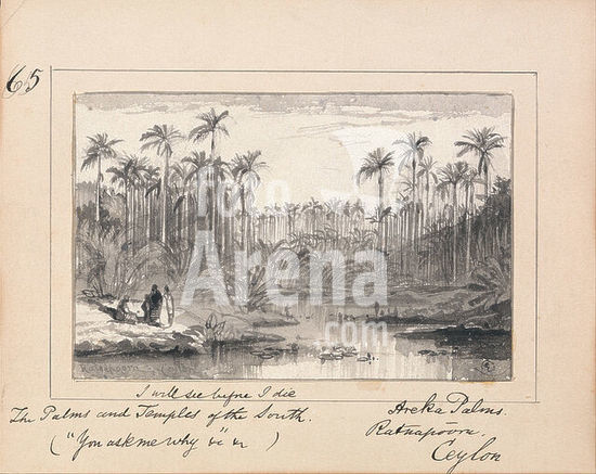 alb3896273 Illustration to Tennyson's "You Ask Me Why": Areka Palms, Ratanapooru, Ceylon - `I will see before I die The Palms and Temples of the South'. Landscape. Pen in black and gray ink with gray wash on moderately thick, moderately textured, cream wove paper. Height: 162 mm (6.37 in); Width: 203 mm (7.99 in). Author: Edward Lear.