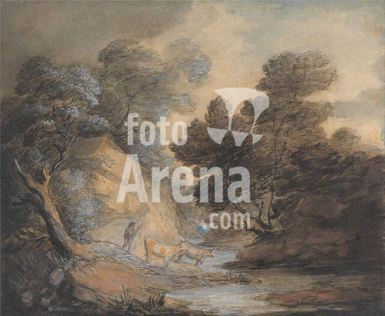 alb3898078 Cattle Watering by a Stream. Drawing. Watercolor and gouache with black chalk over graphite on medium, slightly textured, cream laid paper. Height: 295 mm (11.61 in); Width: 362 mm (14.25 in). Author: Thomas Gainsborough.