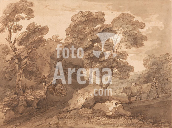 alb3898104 Landscape with Cows. Drawing. Brown and gray wash with pen and brown ink over graphite or black chalk on moderately thick, slightly textured, cream wove paper with embossed gold border. Height: 276 mm (10.86 in); Width: 371 mm (14.60 in). Author: Thomas Gainsborough.