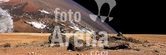 alb5568799 An artist's depiction of the view from a rocky and barren alien world. A large Earth-like planet rises over the airless environment.