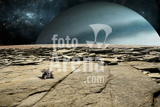 alb5567624 A rover explores the surface of a rocky and barren moon. A large Jupiter-like planet rises over the horizon.