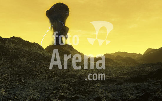alb5566637 An artist's depiction of the view from a rocky and barren alien world. A large cloud covered planet rises over the airless environment.