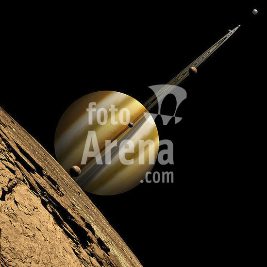 alb5569505 An artist's depiction of a ringed gas giant planet with six moons. The view is from the rocky surface of the sixth and farthest moon. A nearby star illuminates the scene.