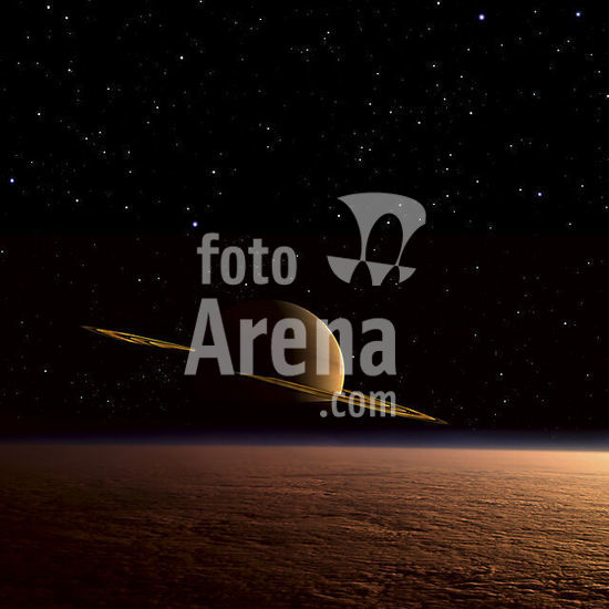 alb5569919 The ringed gas-giant Saturn floats some 1,220,000 kilometres in the background beyond Titan. The orange cloud-cover of Titan is made up almost entirely of nitrogen with traces of methane, ethane and other gases. Titan is the second largest satellite in the solar system with a diameter of 5150 kilometres. Beneath the heavy cloud cover lies a rock and ice surface with oceans of liquid methane. The Cassini-Huygens Probe landed January 18, 2005 on the rocky pebble-strewn terrain of Titan after sinking through miles-thick smog.