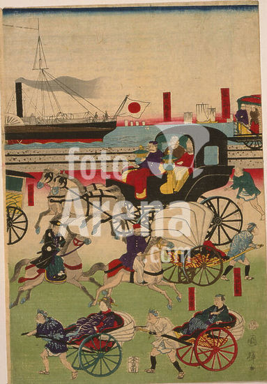 akg5325688 Kuniteru Utagawa, 1830?-1874. Japanese triptych (incomplete) print showing Japanese and foreign people in Tokyo riding in or pulling a variety of vehicles including carriages, rickshaws, tricycles, and trains; also shows ships at sea in the background. S. n, 1871. Woodcut, color; each block 35 × 24.2 cm, each sheet 35.8 × 24.7 cm.