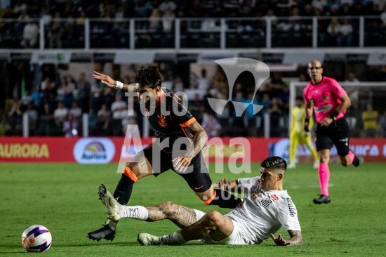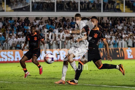 2872086 Yuri Alberto (Corinthians) e Gabriel Brazão (Santos) durante a partida entre Santos e Corinthians, válida pela 4ª rodada do Paulistão, realizada na noite desta quinta (22) na Vila Belmiro em Santos, SP.