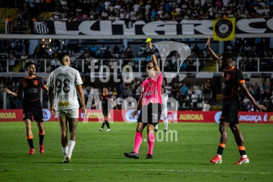 2872092 Árbitro Lucas Canetto Bellote dá cartão amarelo a Adonis Frias (Santos) durante a partida entre Santos e Corinthians, válida pela 4ª rodada do Paulistão, realizada na noite desta quinta (22) na Vila Belmiro em Santos, SP.