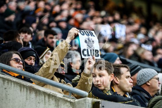 2860900 Torcedores exibem cartazes durante a partida de futebol da Premier League entre Wolverhampton Wanderers e Brentford no estadio Molineux em Wolverhampton, Inglaterra. (Natalie Mincher/SPP)