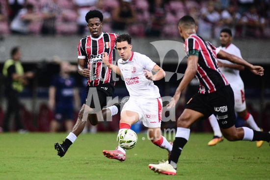 2874296 Atacante Felipe Saraiva (Náutico - centro - com a bola) durante o jogo entre Santa Cruz X Náutico, válido pela quinta rodada do Campeonato Pernambucano de Futebol 2026, disputado na Arena de Pernambuco, em São Lourenço da Mata (PE), Brasil, neste domingo (25).