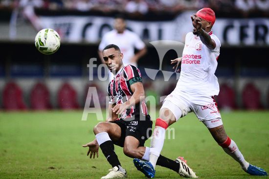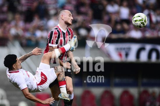 2874297 Meia Dodô (Náutico - esquerda) e zagueiro Ianson (Santa Cruz) durante o jogo entre Santa Cruz X Náutico, válido pela quinta rodada do Campeonato Pernambucano de Futebol 2026, disputado na Arena de Pernambuco, em São Lourenço da Mata (PE), Brasil, neste domingo (25).