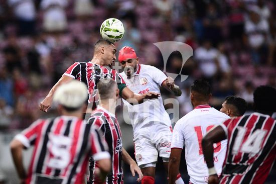 2874299 Zagueiro Eurico Lima (Santa Cruz - esquerda - no alto) durante o jogo entre Santa Cruz X Náutico, válido pela quinta rodada do Campeonato Pernambucano de Futebol 2026, disputado na Arena de Pernambuco, em São Lourenço da Mata (PE), Brasil, neste domingo (25).