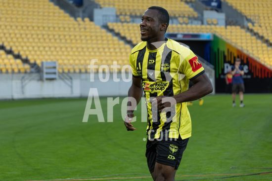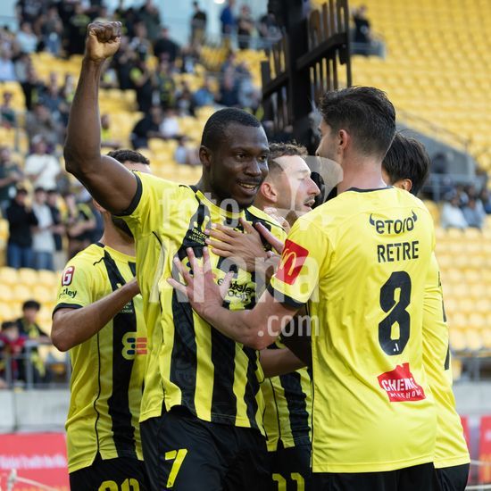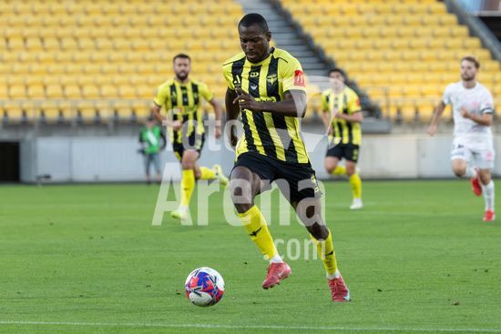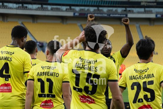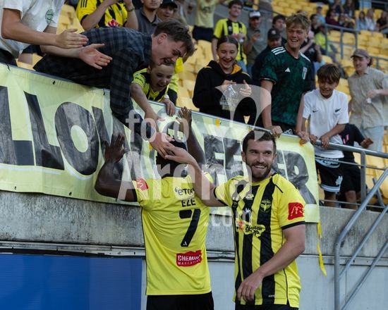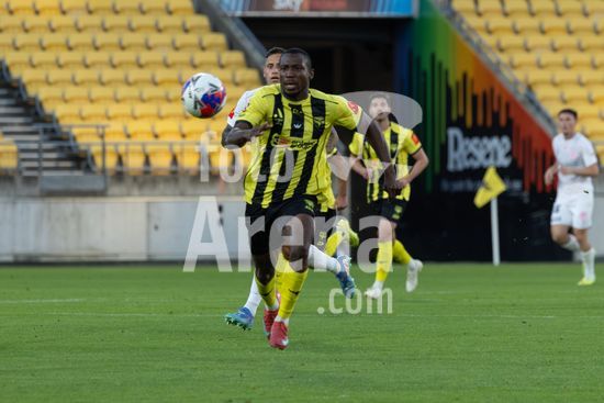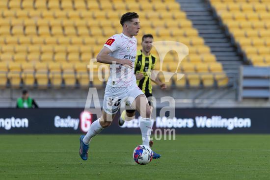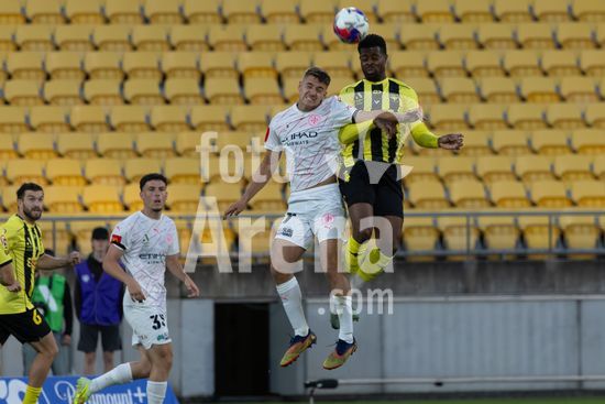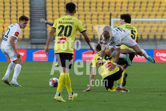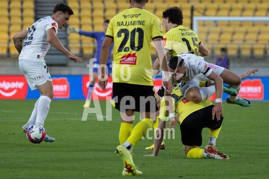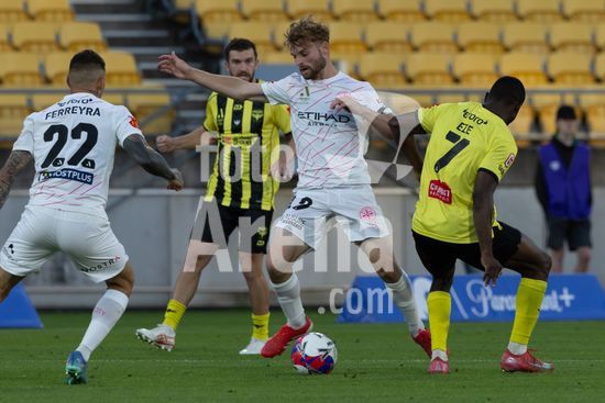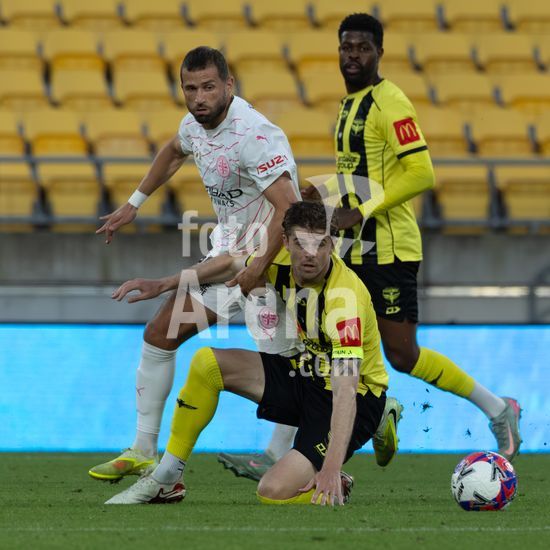 O zagueiro do Wellington, Bill Tuiloma, esta no chao enquanto Max Caputo (17, Melbourne) e o meio-campista do Wellington, Kazuki Nagasawa, disputam a bola. Wellington Phoenix x Melbourne City. Isuzu A League. 15ª rodada. Sky Stadium. Wellington. Nova Zelandia. Wellington Phoenix 2 Melbourne City 2 (intervalo 1-0). (Joe Serci / SPP)