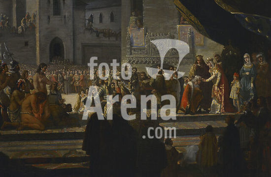 | Descrição: | Columbus received by the Catholic Monarchs in Barcelona (April 1493). Oil on canvas (111 x 144 cm) by Francisco Garcia Ibañez (b. 1825), 1845. Detail. Army Museum. Toledo, Spain. (On loan from Prado Museum, Spain). Author: Francisco Garcia Ibañez (b. 1825). Spanish painter. |
