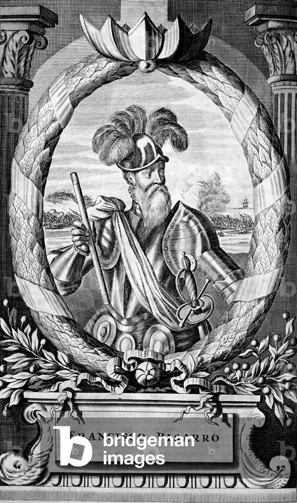 | Pauta: | Portrait de Francisco Pizarro (Pisarro) (en fr. Francois Pizarre, 1478-1541), conquistador espagnol. Il decouvrit le Perou pour le compte du royaume d'Espagne. Gravure de 1671. Francisco Pizarro, 15th century Spanish conquistador, 1671. Later engraving of Pizarro (c1475-1541), conqueror of the Inca empire (1531-1533). |